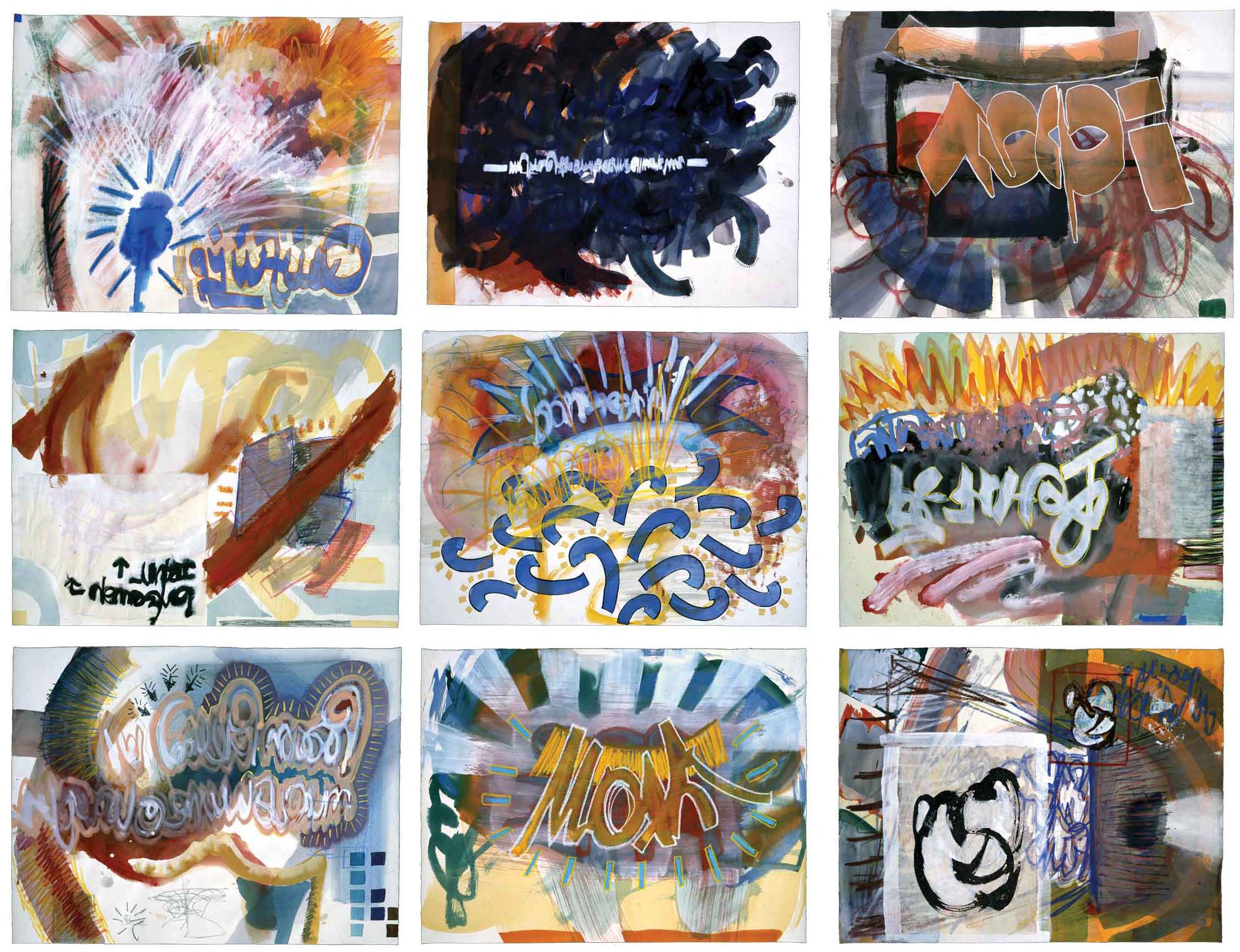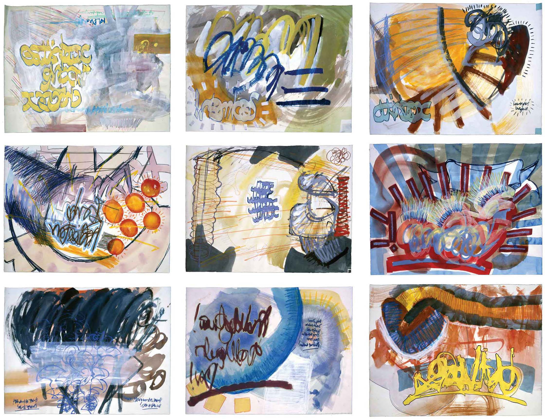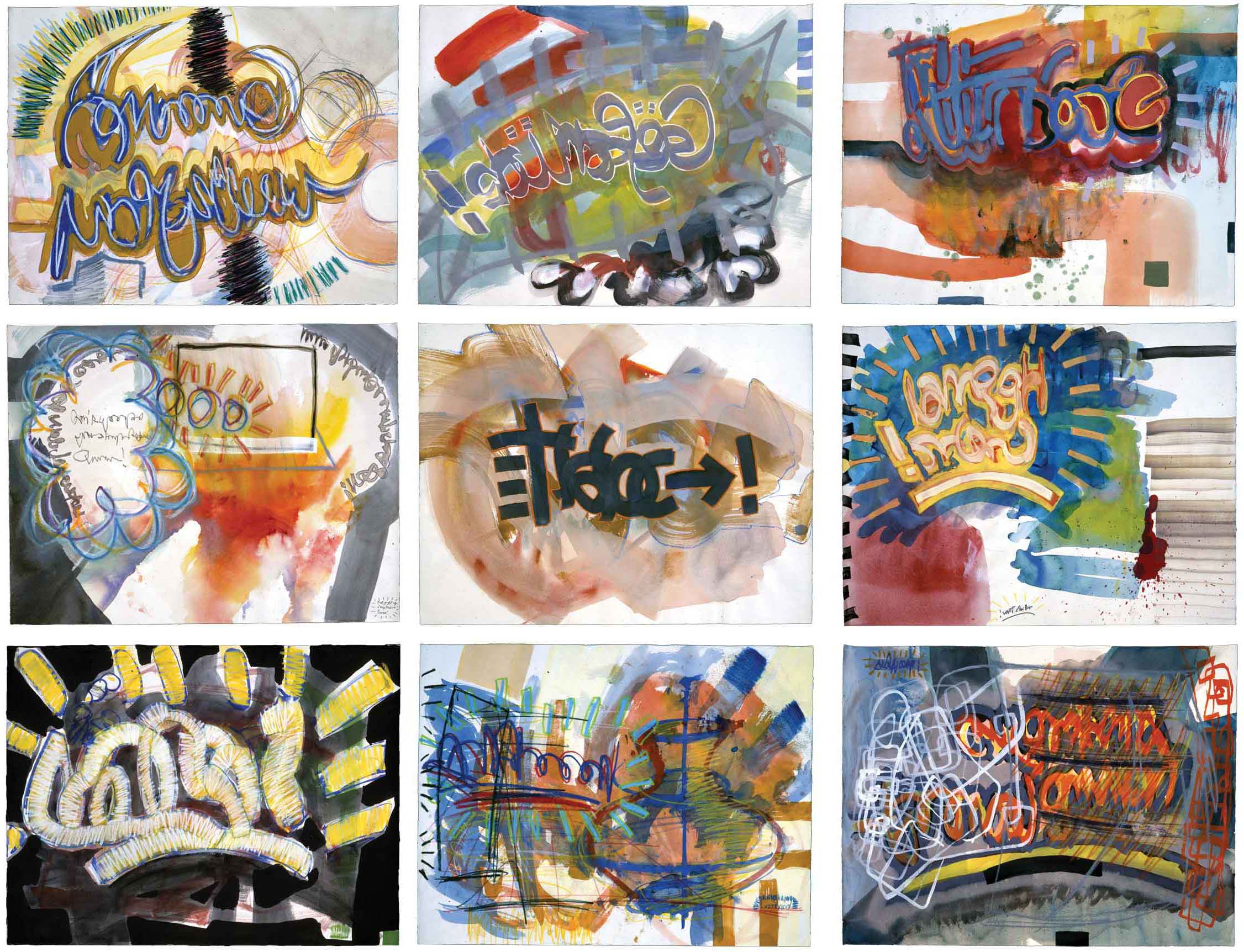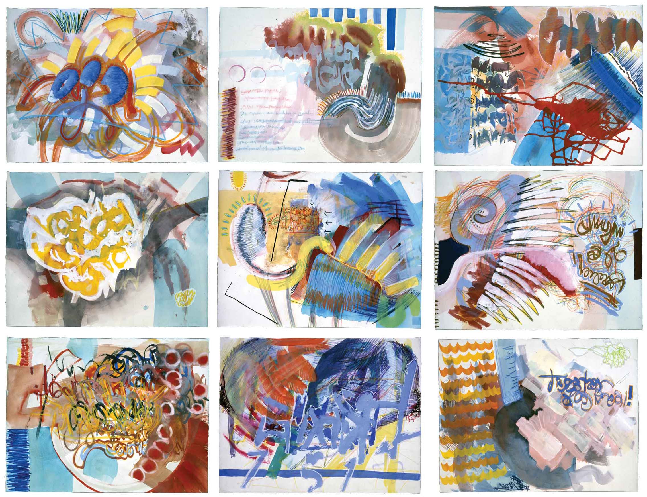 An 81 piece watermedia on paper installation, très riches heures/array was created over the course of a year, while I was working on much larger paintings. I wanted to work on a more intimate scale, exploring the relationship between text, script, mark making color and form. I had been studying Nahuatl, Japanese and Tatar at the time, the idea of script as opposed to text came from that. I was also interested in the idea of projection, that people had to find meaning in what they experienced and viewers wanted to know what the “words” on the paper meant. Viewers also had very distinct ideas on the arrangement of the sheets of paper – they knew which should go next to which, instinctively.